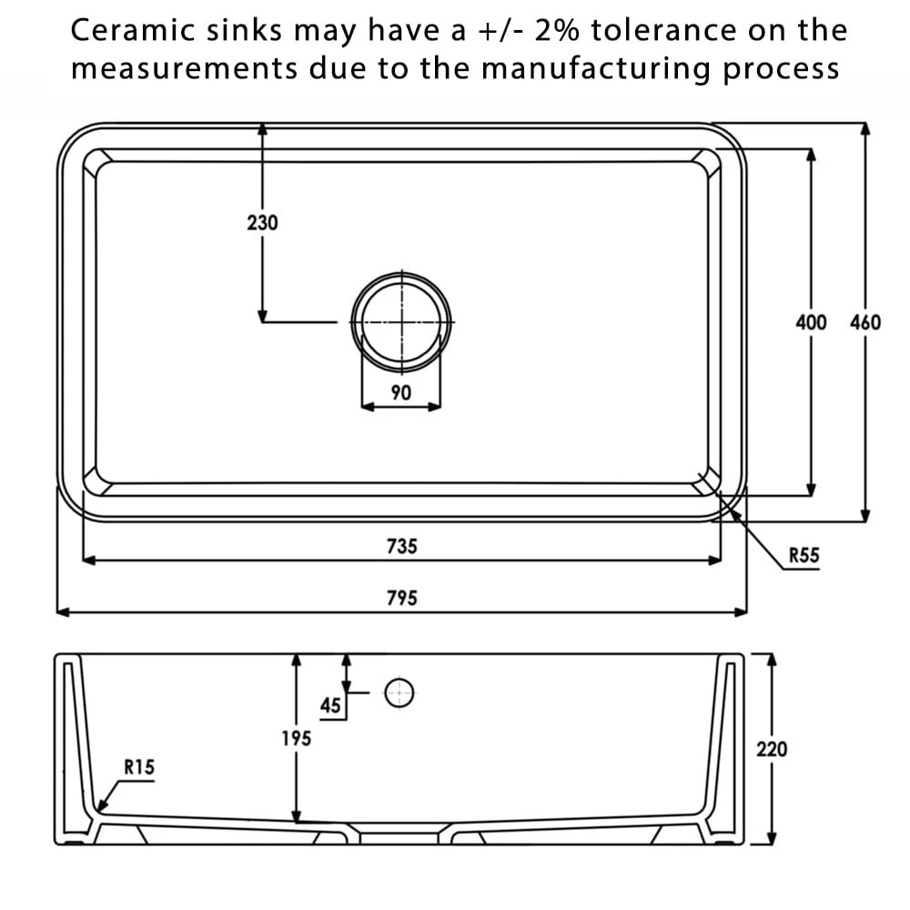 | Main Bowl Size (Length x Width x Depth) | 735mm x 400mm x 195mm |