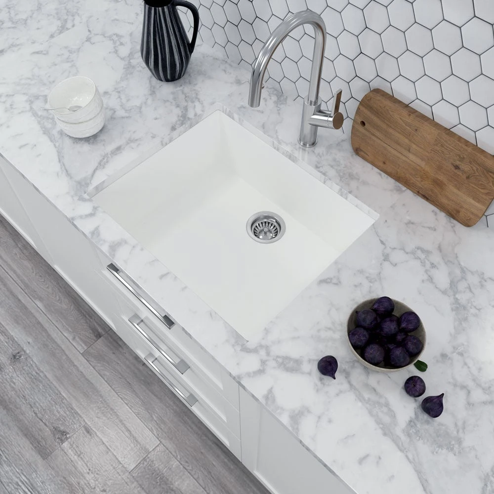 An undermount sink is installed underneath the worktop and to achieve a perfect finish – whether you choose a flush or reveal cut – the sink must be used as a template to cut the worktop. Undermount sinks are generally suitable for installation with the following types of worktops: natural wood, granite, quartz, ceramic, glass, corian, solid laminate and stainless steel. It is generally not suitable for installation with standard laminate worktops. For full compatibility information, contact your worktop supplier.