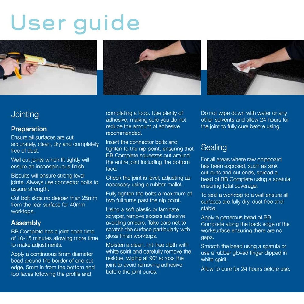 - With BB Complete all worktop joints are guaranteed for 3 years against moisture ingress and expansion. Get the benefit of total peace of mind on all your worktop installations.