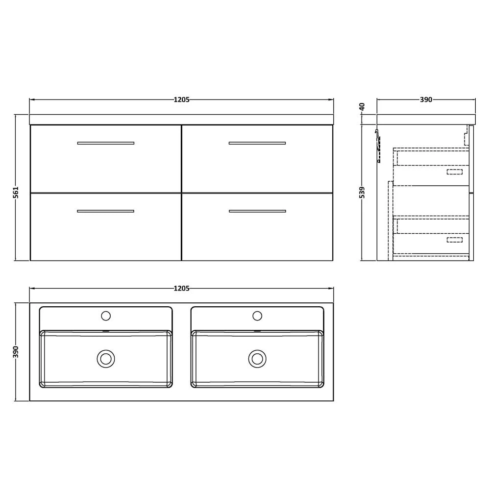 Nuie Arno Charcoal Black 1200 WH 4-Drawer Vanity Unit & Double Basin