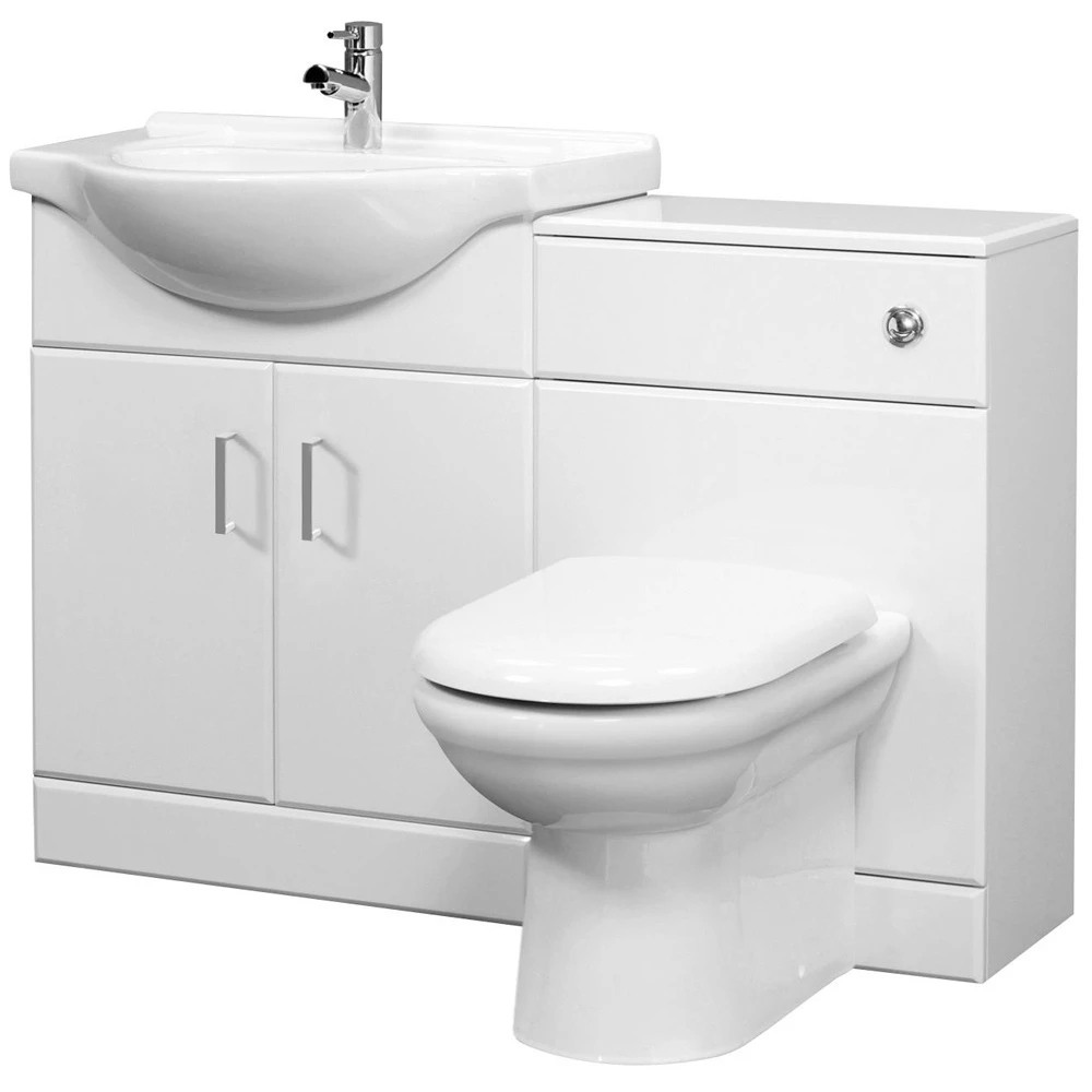 - Nuie Saturn all in one furniture pack which include basin cabinet, toilet cistern cabinet, ceramic basin, toilet cistern with chrome push button flush, toilet pan and soft close seat.