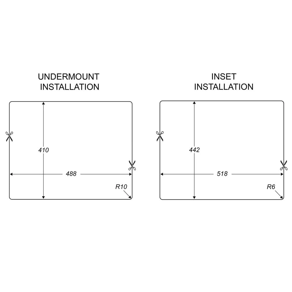 An undermount sink is installed underneath the worktop and to achieve a perfect finish – whether you choose a flush or reveal cut – the sink must be used as a template to cut the worktop. Undermount sinks are generally suitable for installation with the following types of worktops: natural wood, granite, quartz, ceramic, glass, corian, solid laminate and stainless steel. It is generally not suitable for installation with standard laminate worktops. For full compatibility information, contact your worktop supplier.