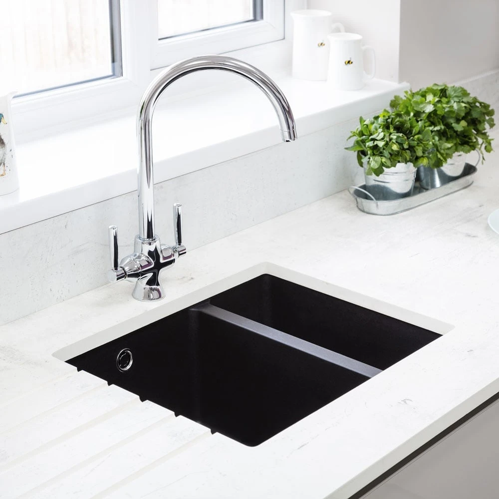 Please note: Due to the way in which granite sinks are manufactured, it is very difficult to achieve a jet black colour. Granite sinks are always slightly towards a dark grey colour, and for a perfect jet black finish we would recommend looking at our range of ceramic kitchen sinks.